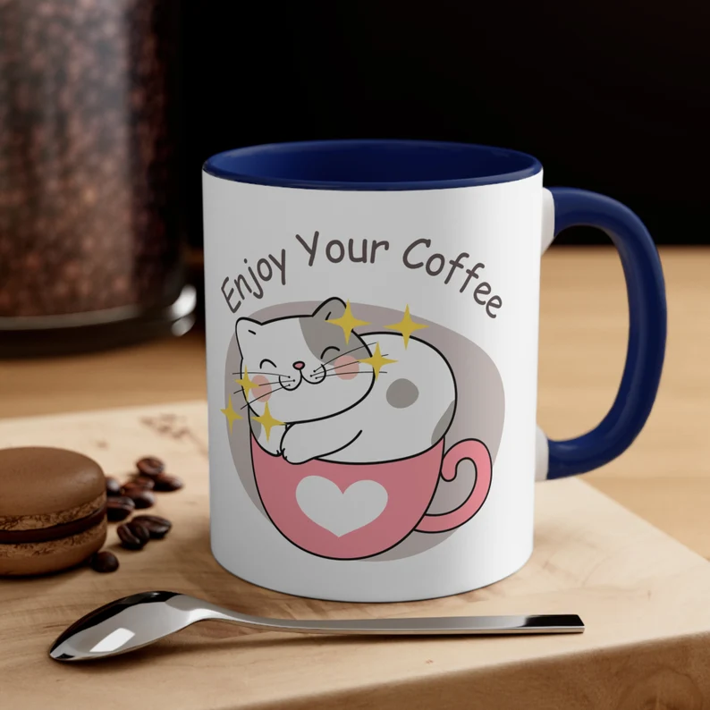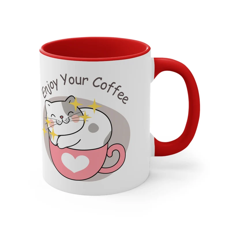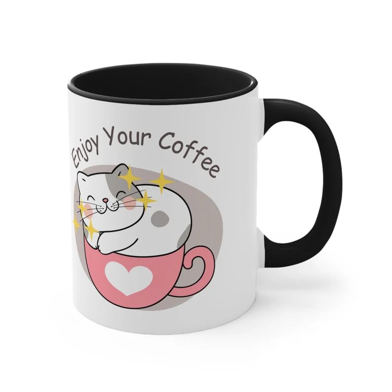 - Indulge in your morning ritual with our adorable ‘Enjoy Your Coffee’ mug featuring a charming sleeping cat photo! Crafted from durable ceramic, this 11 oz mug adds a delightful touch to your coffee or tea time.