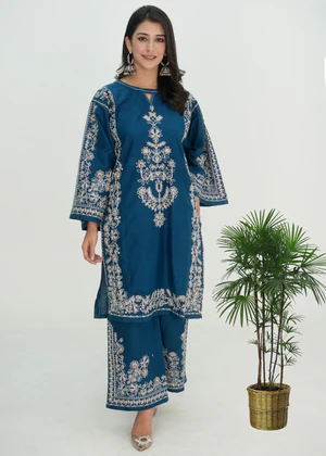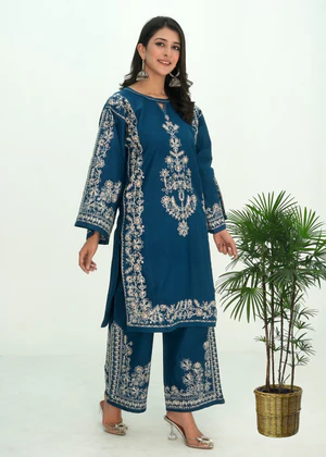 • Zille exquisite two-piece co-ord set in Sapphire Blue features Cotton Dobby fabrics for both the shirt and straight trousers. The Zille-z straight-cut shirt boasts intricate embroidery on the front and sleeves, making it a perfect choice for daily wear during the summer season.